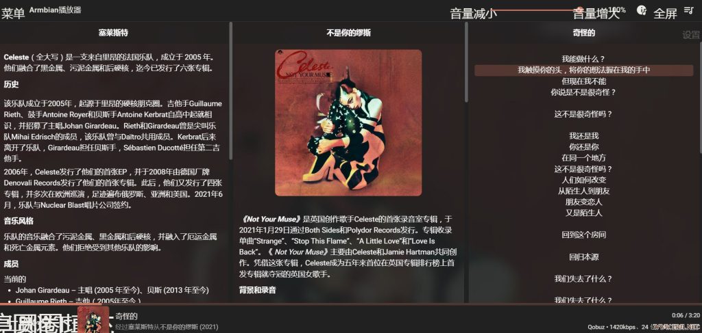 - Custom Browse、Music Information Screen:增强浏览和信息显示体验,在CHROME浏览器里面,利用谷歌翻译,实时呈现中文歌词和艺术家信息Material Skin 插件